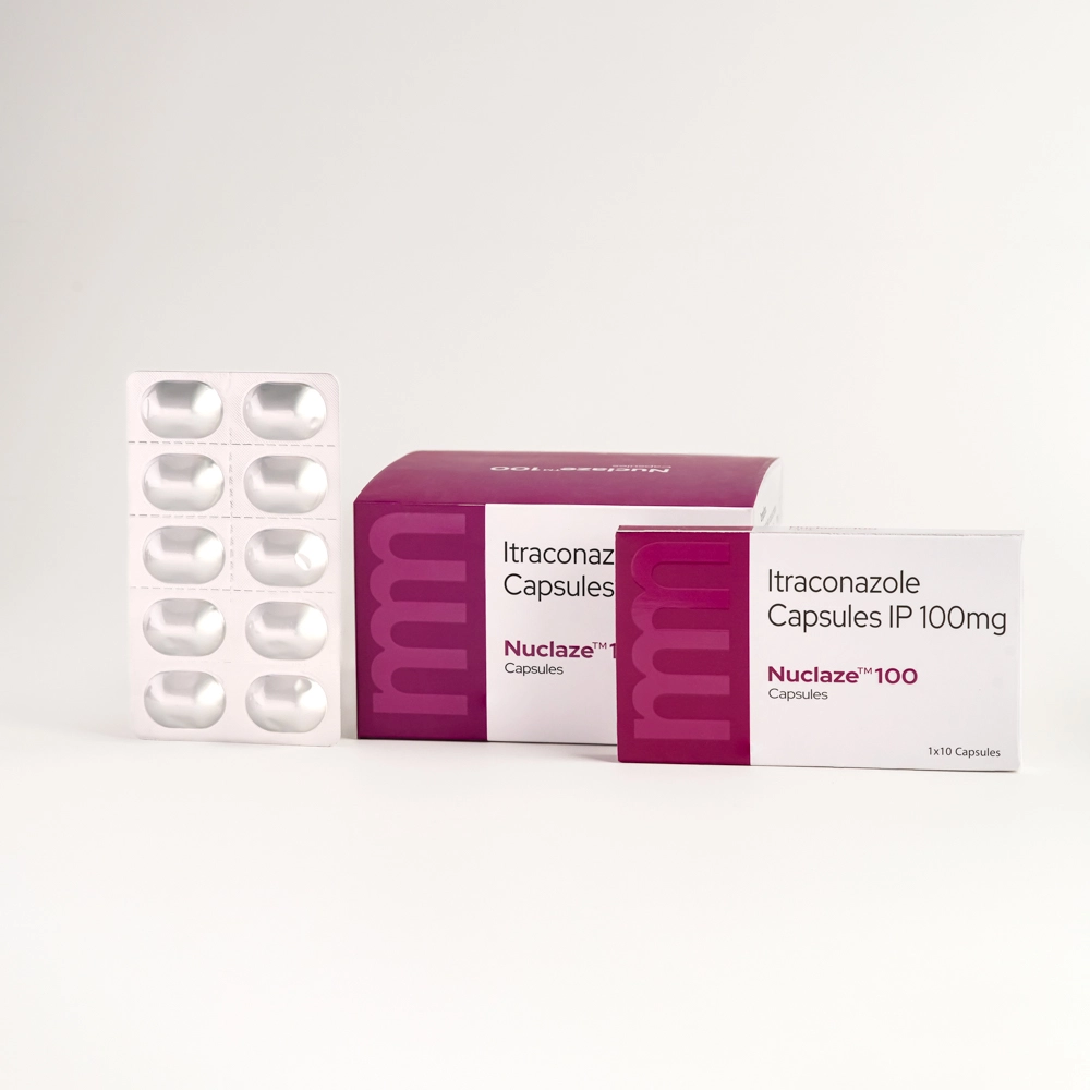 Nuclaze™ 100 is an oral antifungal formulation developed to assist healthcare professionals in the management of systemic and superficial fungal infections. The formulation supports antifungal therapy in dermatological conditions involving skin, hair, and nail infections caused by susceptible fungal organisms.